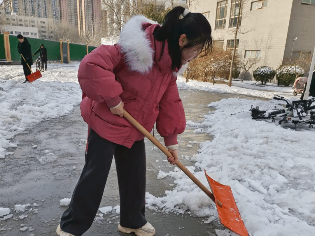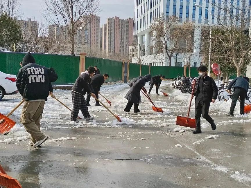 尽管寒风凛冽,积雪深厚,但师生们的热情丝毫未减。在老师们的有序带领下,同学们迅速领取铁锹、扫帚等清雪工具,投入到紧张的清雪工作中。大家分工明确,有的负责铲除主干道上的厚积雪,有的清理人行道上的薄雪和结冰区域,还有的清扫阶梯边缘及公共设施周边的积雪。党员、入党积极分子们充分发挥先锋模范作用,不畏寒冷,干劲十足,全力清除特教楼前的积雪,师生们的出行安全得到了有效保障。