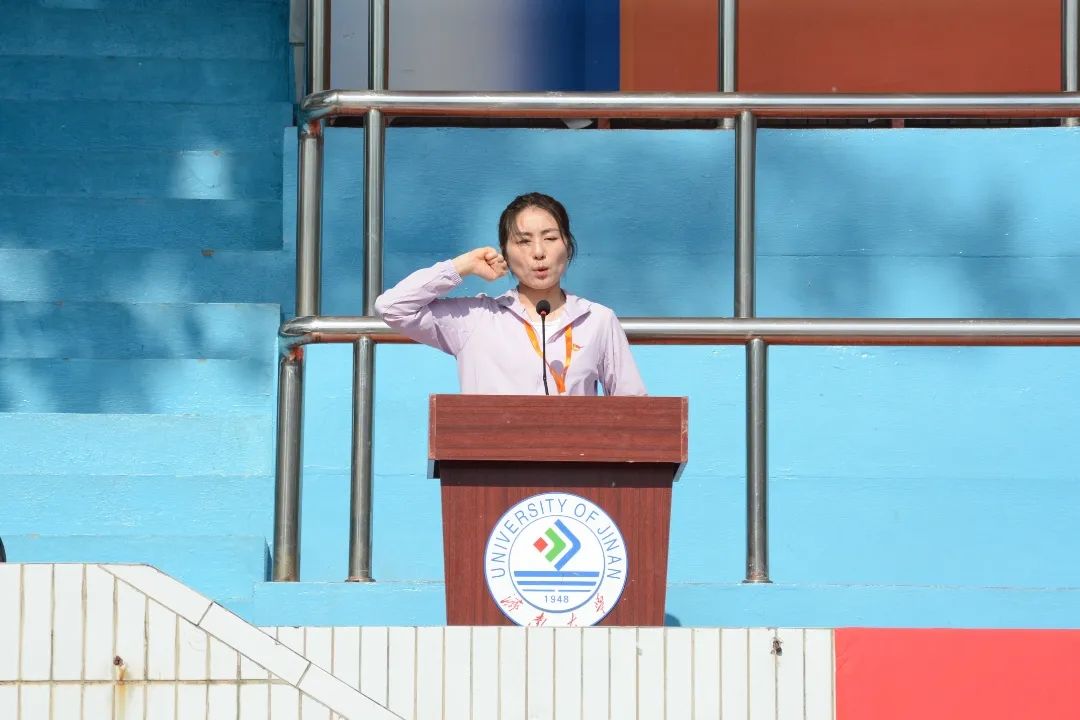 在介绍完出席的领导、嘉宾后,全体肃立,激昂的国歌奏响。那声音回荡在操场的每一个角落,也激荡在每个人的心中。紧接着,学校党委书记刘春华宣布济南大学2025年田径运动会暨第五届体育文化艺术节开幕。校长刘宗明致开幕词。勉励各参赛成员,在赛场秉持高尚品德,于竞技中追求卓越成绩。