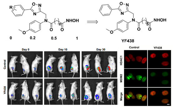 合作团队近年来对N-原子双取代的异羟肟酸类HDAC抑制剂的设计合成、构效关系和抗肿瘤活性进行了系统研究,发现其中的YF438可以特异性的抑制多种三阴性乳腺癌细胞的生长和转移,并在动物模型上显示了良好的效果和较低的毒性。深入的机制研究表明,MDM2蛋白在多数TNBC细胞中高度表达,该化合物通过影响HDAC1-MDM2-MDMX复合物的稳定性,促进了MDM2的泛素化自降解,并可能通过降低MDM2作为E3连接酶的活性对其下游肿瘤相关蛋白也产生影响,从而抑制肿瘤的发生和发展。众所周知,HDAC抑制剂在临床上主要用于血液系统癌症和淋巴瘤的治疗,对实体瘤的治疗效果有限;而TNBC则因为缺乏有效的靶点一直是肿瘤治疗领域的巨大挑战。因此,该项研究结果有望推动HDAC和MDM2小分子抑制剂在TNBC治疗上的研究进展,为开发理想的靶向药物提供重要的理论依据和知识储备。