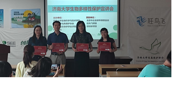 、济南大学鸟类保护协会、济宁市创建国际湿地城市工作领导小组办公室以及济宁市南四湖自然保护区服务中心联合举办的“南阳湖与独山湖常见鸟类竞猜”、“周周鸟鸣”鸟种有奖竞猜”等活动获奖的同学颁奖。