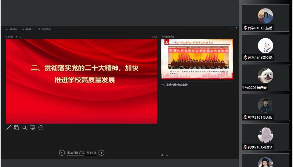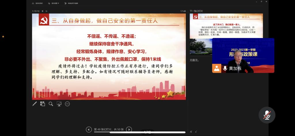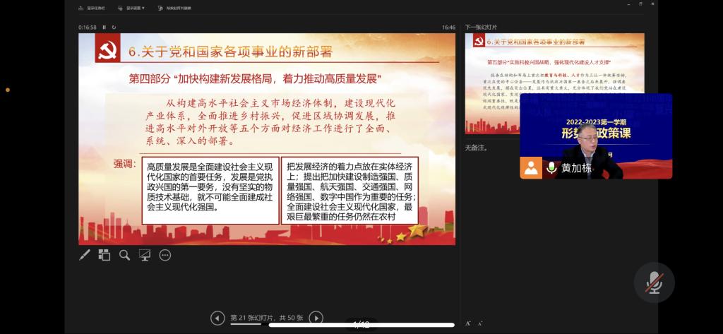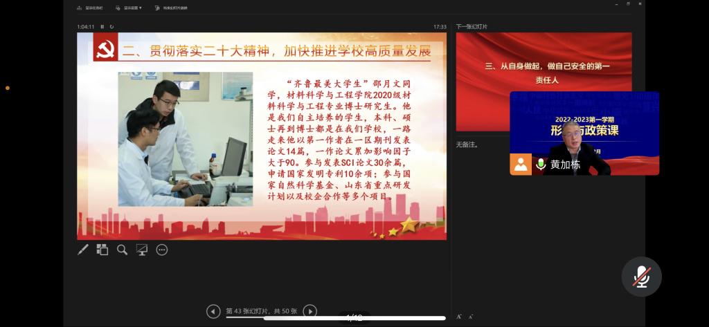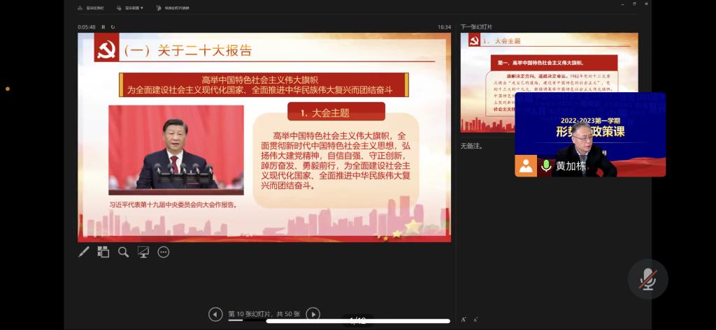 为深入学习宣传贯彻党的二十大精神,充分发挥思想政治理论课主渠道作用,落实立德树人根本任务,12月6日,济南大学党委常委、副校长黄加栋以在线形式为金沙国际