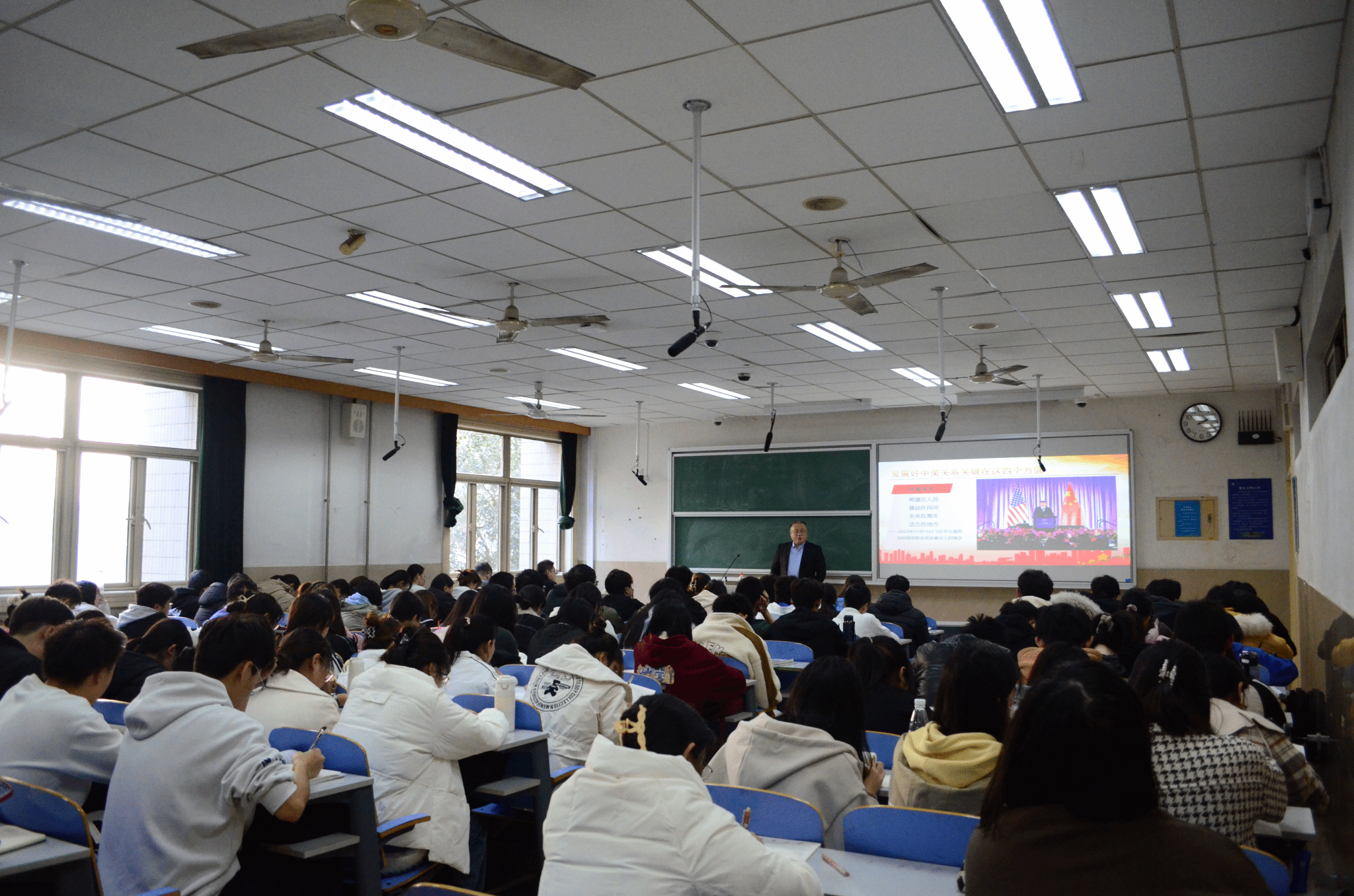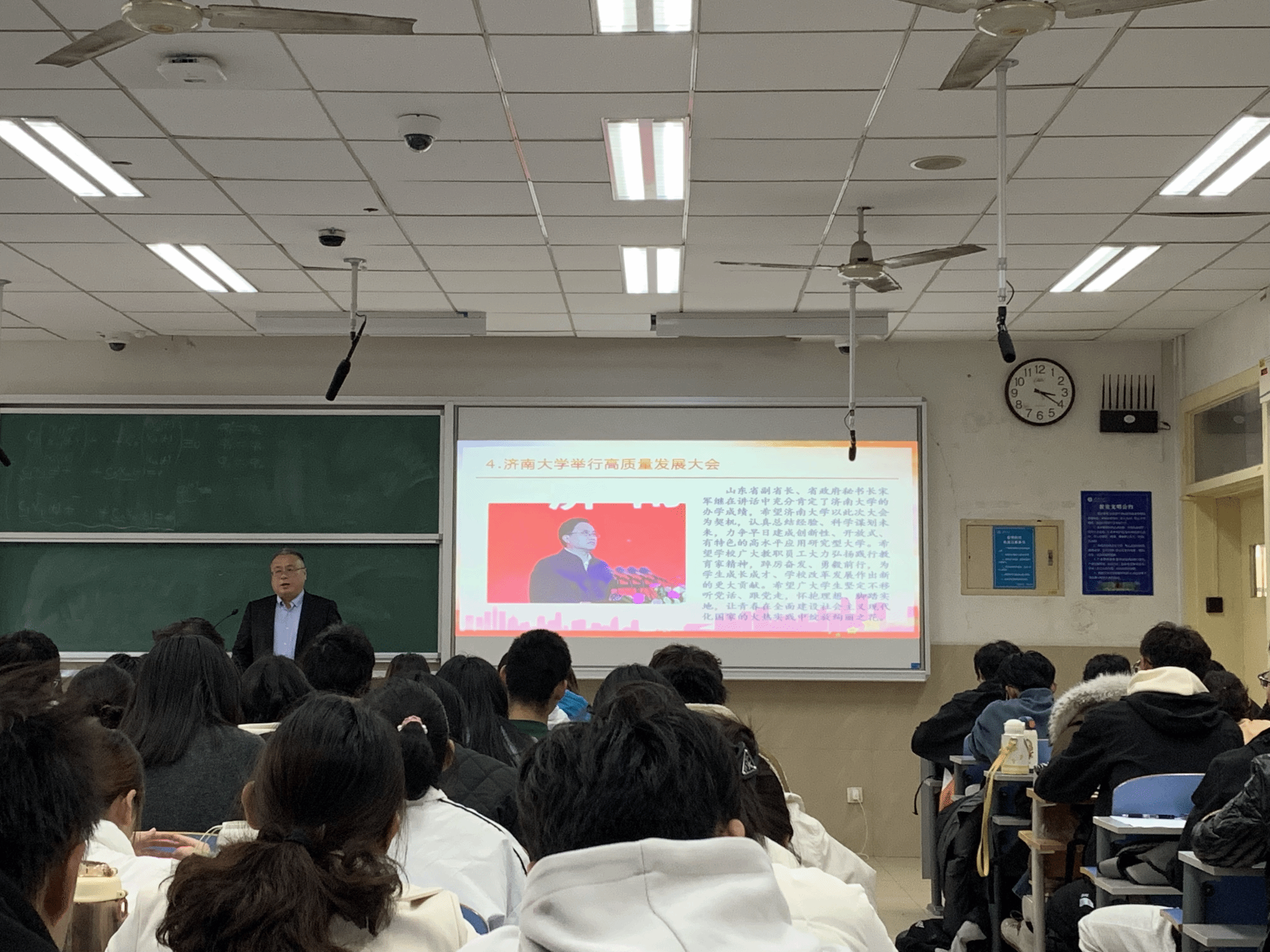 首先,黄加栋副校长带领着同学们深入学习了中美元首会晤的成果与精神,他向同学们详细介绍了此次元首会晤的进程、会晤的三个特点,讲解了发展好中美关系重在关注的四个方面以及此次会晤达成的共识和成果。随后,黄加栋副校长对于我国下半年的经济工作新动向进行了深入阐释,他强调,2023年是全面贯彻落实党的二十大精神的开局之年,做好经济工作十分关键,中央的经济会议精神,传递出坚定推进经济高质量发展新动向。接着,他向同学们介绍了我校的高质量发展所取得的成就,他强调济南大学建校已有75周年,底蕴深厚,桃李芬芳,我们要聚力同行、共创一流,推动学校高质量发展。