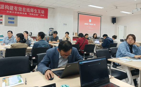 济南大学教师发展咨询专家、机械工程学院教授王潍受邀担任授课嘉宾。王潍教授从课堂派的安装和使用入手,以自身的课程为例,详细讲解了课堂派的使用方法,以及在课堂建立师生互动的技巧。随后王潍教授从互动课件、弹幕互动、团队协作、小组作业等方面进行了一一演示。授课结束后,参会教师与王潍教进行交流互动,纷纷表示受益良多。